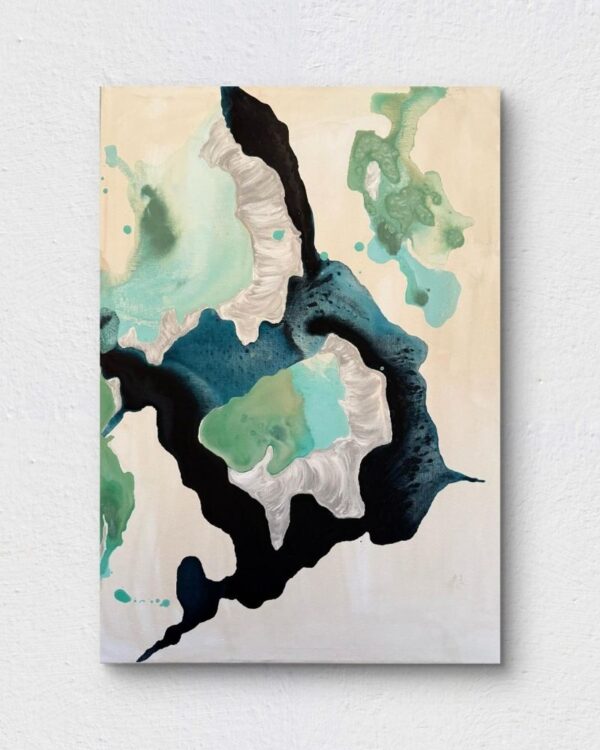 Julia Petutschnig, Loslassen VI. Acrylfarbe auf Leinwand, 50×70 cm mit dunkelblauen Schattenfugenrahmen von Ende 2025.